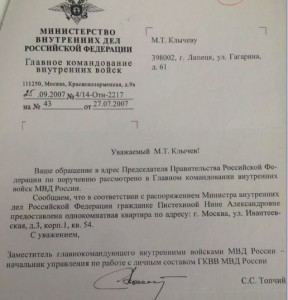 Подтвердить это может не только женщина, но и документы, подписанные генералом, который сначала заявляет, что Пистехина отказалась от квартиры сама, а потом говорит, что жилье в Москве ей предоставлено.