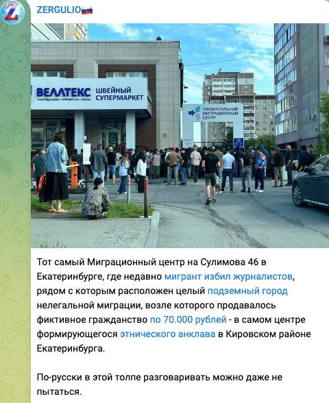 «Пока Госдума имитирует борьбу с нелегальной миграцией, каждый день в Россию приезжают тысячи и тысячи мигрантов. В толпе практически одни мужчины - своих детей, жен, родителей, бабушек и дедушек они привезут и посадят на социалку и бюджет позже, когда сами купят/получат гражданство РФ», - пишет Zergulio, подчеркивая, что живет рядом с этим миграционным центром и наблюдает процесс формирования этнического анклава с 2017 года.