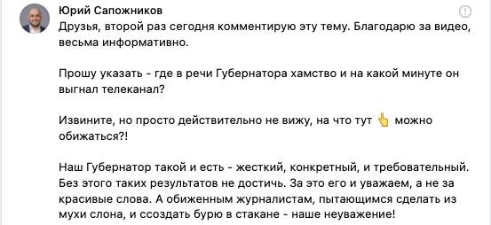 «Извините, но просто действительно не вижу, на что тут можно обижаться?! Наш Губернатор такой и есть - жесткий, конкретный, и требовательный. Без этого таких результатов не достичь. За это его и уважаем, а не за красивые слова. А обиженным журналистам, пытающимся сделать из мухи слона, и создать бурю в стакане - наше неуважение!», - прокомментировал видео Сапожников.