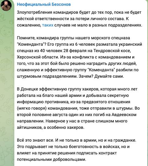 «И сейчас это действительно не вопрос буквы закона. Это вопрос справедливости и надежды у бойцов. Если Пузик выйдет сухим из воды – авторитет Рэмыча »(Андрея Рэмовича Белоусова - прим.ред) сильно просядет, а бойцы поймут, что надежды на спасение от самодуров нет. Захочет ли кто-то идти на контракт когда его могут просто списать в утиль за кривой взгляд? Захочет ли кто-то сообщать военпрокуратуре или ДВКР о пи....це, если командир всегда выйдет сухим из воды? Или предпочтет не идти смертником к мясникам? А если пошёл – при такой ситуации дезертировать, предпочтя тюрьму бессмысленной смерти? А если не может дезертировать..." - задается вопросами ветеран СВО.