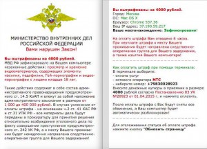 Во время просмотра приватных сайтов на экране может появиться всплывающее окно с эмблемой Министерства внутренних дел РФ. Баннер пестрит статьями административного и уголовного кодекса РФ, призывая пользователя поскорее оплатить штраф в ближайшем терминале.