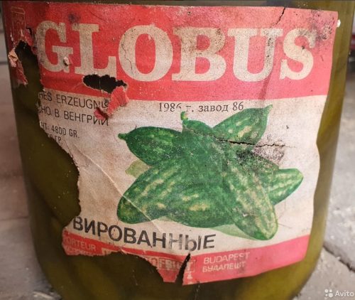 Как отмечает продавец, банку хранили в сухом погребе при температуре около 8С. Предмет, несмотря на сроки, пребывает в отличном состоянии: и крышка, и сама банка, и содержимое — огурцы — вполне еще ого-го. Вот только этикетка местами отклеилась, да и есть продукт москвич не советует.