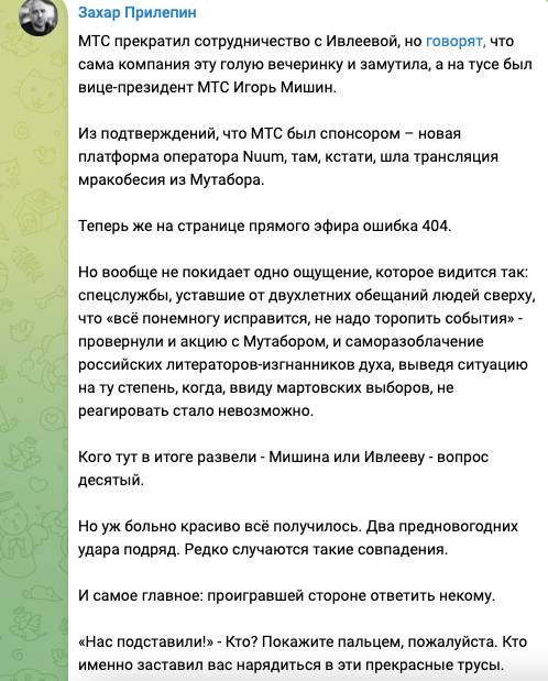 «МТС прекратил сотрудничество с Ивлеевой, но говорят, что сама компания эту голую вечеринку и замутила, а на тусе был вице-президент МТС Игорь Мишин. Из подтверждений, что МТС был спонсором – новая платформа оператора Nuum, там, кстати, шла трансляция мракобесия из Мутабора. Теперь же на странице прямого эфира ошибка 404».