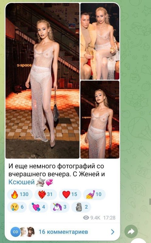 По информации канала, на вечеринке также была супруга девелопера Павла Те (застройщик, близкий к Собянину) Ольга Карпуть. А рядом с Карпуть заметили Ксению Чилингарову — дочь обладателя звезд Героя СССР и РФ Артура Чилингарова, вице-президента Русского географического общества и бывшего депутата ГД двух созывов. Но виноваты во всем по-прежнему только артисты.