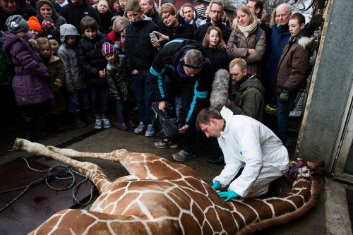 This handout photo released on February 11, 2014 shows a veterinarian making an open to public autopsy on a giraffe Marius on February 9 at a zoo in Copenhagen. Although thousands had signed an online petition and other European zoos had offered to take it, the giraffe was put down. The zoo said it had no choice because of its duty to avoid in-breeding., Image: 184278234, License: Rights-managed, Restrictions: DENMARK OUT, Model Release: no, Credit line: Profimedia, AFP