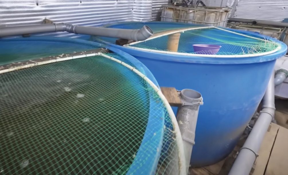 Чтобы разводить рыбу, необходима установка бассейнов для выращивания и система труб, по которым идет ненужная вода. Четыре бассейна объединяются системой для отвода воды: по одной трубе включается в барабанный фильтр, из барабанного фильтра, соответственно, в биофильтр, затем снова вытекает в бассейн. Цикл небольшой, один такой «квадратик» объединяет 4,5 т рыбы.