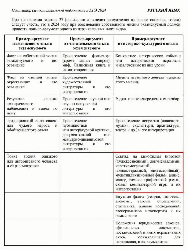 Согласно представленной таблице, экзаменуемые могут ссылаться на различные источники, включая мнение авторитетных лиц, произведения искусства, радио- или телевизионные программы, а также на материалы из аниме, манги, комиксов, сюжеты компьютерных игр и другие подобные источники.