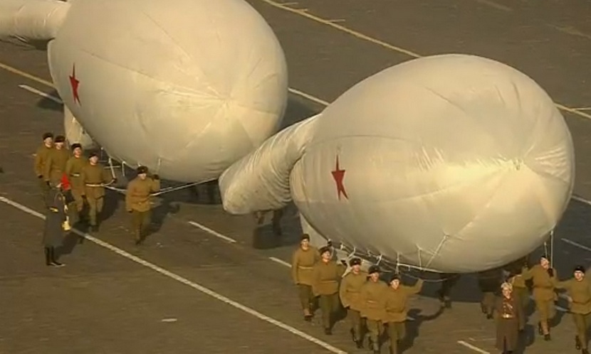 После речи Собянина и театрализованного представления начался военный парад. Впервые в нем приняли участие аэростаты - такие же, как те, что защищали московское небо в годы войны от налетов немецкой авиации.