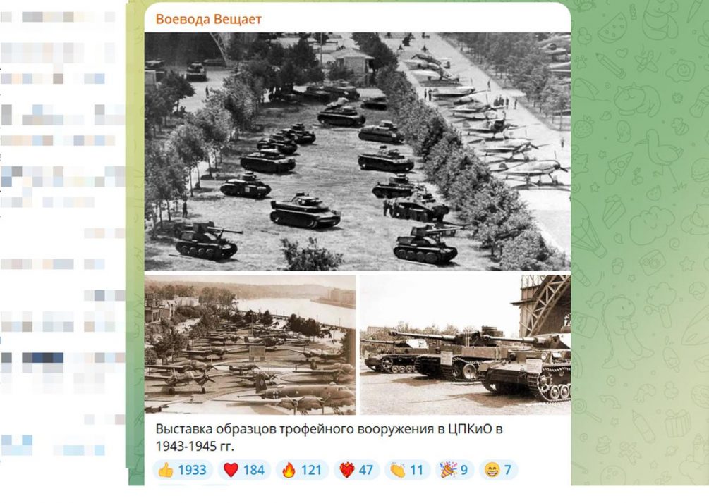 «Те, кто не извлекает уроков из истории, обречены повторять ее»: две московские выставки трофейной техники пошли по мировым соцсетям», — отмечает телеграм-канал «Пул N3» и публикует англоязычный твит с двумя картинками. На одной — выставка 2024 года с разбитой западной техникой в ходе СВО, на другой — такая же экспозиция, но времен 1943 года с подбитой техникой фашистской Германии.