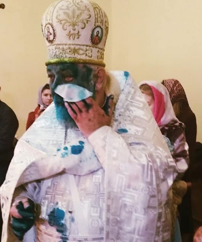 На фотографиях видно, что зеленкой полностью залито лицо священника. Жидкость попала ему и в глаза. В каком состоянии его здоровье пока неизвестно.