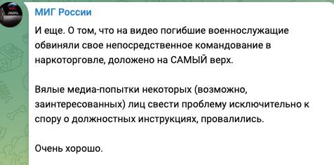 Автор канала «МИГ России» прокомментировал ситуацию, обратив внимание на то, что причиной отправки на верную смерть ценных специалистов стало активное противодействие ими «системной (!) наркоторговли в боевом подразделении, которое командование не просто не пресекало, а непосредственно участвовало в этом »бизнесе".