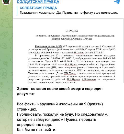 Автор канала «Солдатская правда» Михаил Полынков сообщил, что у него есть документы, которые лично ему передал «Эрнест». Девятистраничный документ содержит список предполагаемых нарушений, которые необходимо проверить. Полынков готов их передать следствию.