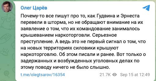 Живущий в России украинский политик Олег Царев тоже не остался в стороне от скандала с гибелью дроноводов. Он сравнил «Гудвина» и «Эрвина» с японскими самураями, которые пожертвовали собой, чтобы навредить врагу, а именно тем, кто, распространяя наркотики, уничтожает российских солдат и наносит вред армии.