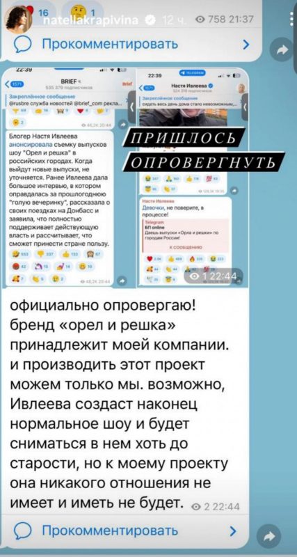 «Официально опровергаю! Бренд «Орел и решка» принадлежит моей компании. И производить этот контент можем только мы. Возможно, Ивлеева создаст наконец нормальное шоу и будет сниматься в нем хоть до старости, но к моему проекту она никакого отношения не имеет и иметь не будет», — наотрез заявила Нателла в запрещенной соцсети.
