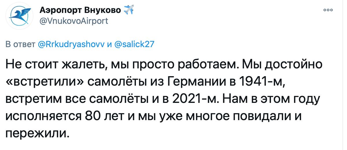 «Не стоит жалеть, мы просто работаем. Мы достойно «встретили» самолёты из Германии в 1941-м году, Встретимся все самолёты и в 2021-м. Нам в этом году исполняется 80 лет и мы многое уже повидали и пережили», - гласит запись в Twitter.