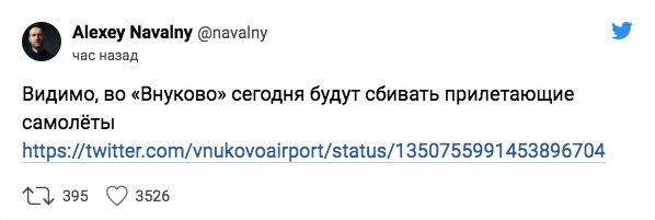 На твит отреагировал Алексей Навальный, который написал: «Видимо, во «Внуково» сегодня будут сбивать прилетающие самолёты».