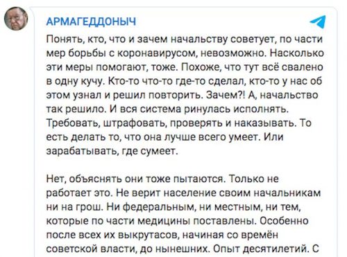Политолог подчеркивает, что невозможно понять, кто, что, зачем дает советы начальству в вопросах борьбы с коронавирусом. «Кто-то что-то где-то сделал, кто-то у нас об этом узнал и решил повторить. Зачем?! А, начальство так решило. И вся система ринулась исполнять. Требовать, штрафовать, проверять и наказывать. То есть делать то, что она лучше всего умеет. Или зарабатывать, где сумеет», - пишет Сатановский.
