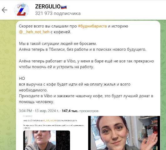 «Судя по этому посту, хозяйка кофейни теперь в Грузии, а релоканты собирают ей донаты - сообщается, что »выручка с кофе будет идти ей на оплату жилья и всего необходимого«», - пишет Колясников.