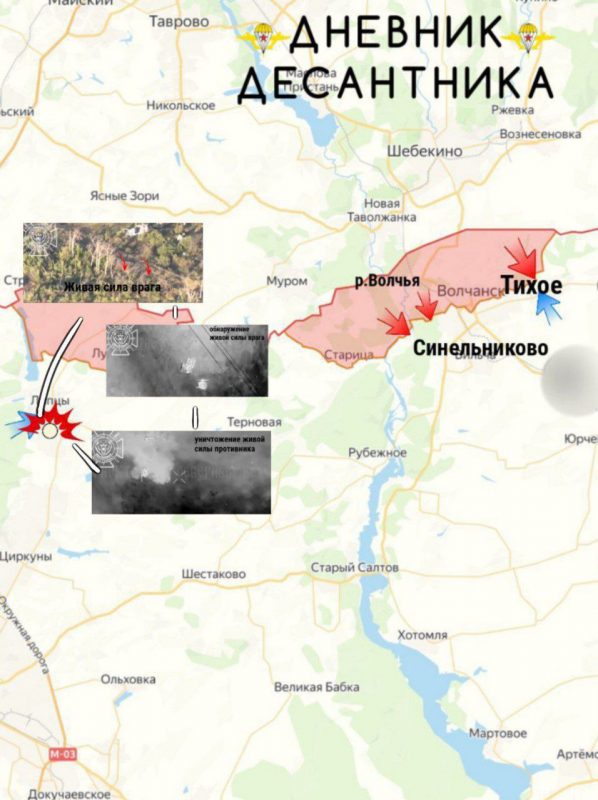 На Харьковском направлении продолжаются ожесточённые бои. Российские подразделения продвигаются на левобережье Волчанска примерно на 200 метров и продолжают наступление на востоке, в районе населённого пункта Тихое.