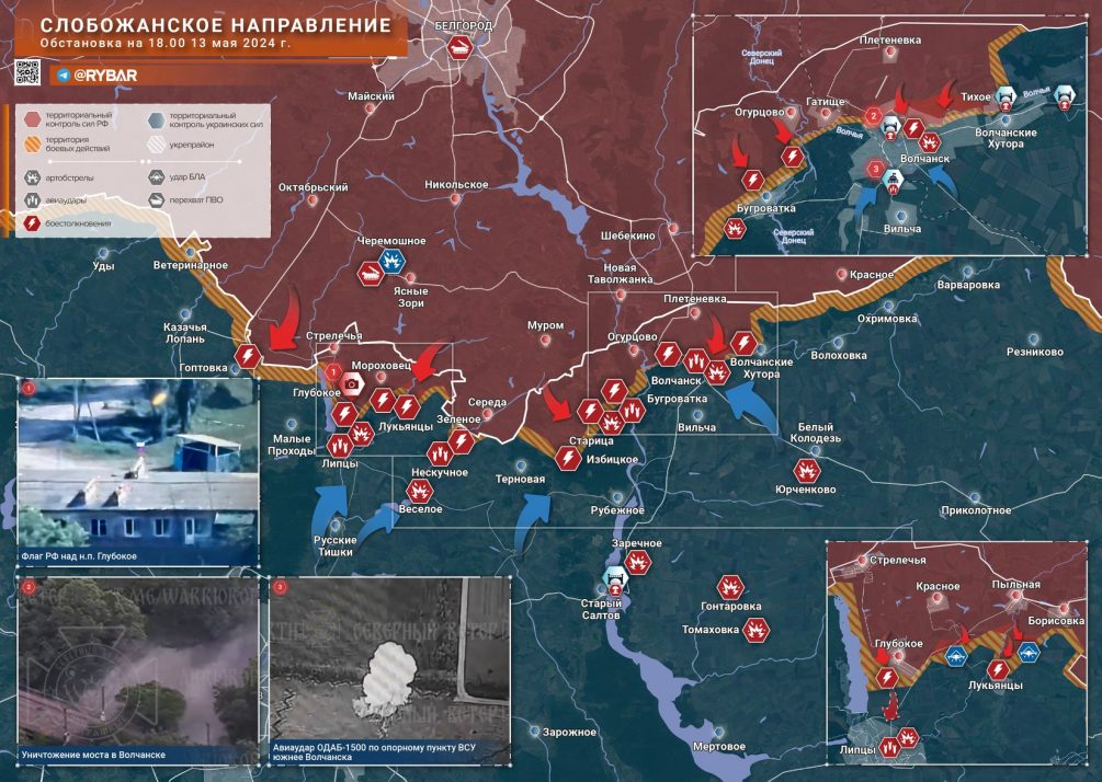 Территория Волчанска к северу от разделяющей город реки Волчья и востоку от Соборной улицы практически полностью перешла под контроль российских сил. Бойцы ВС РФ прорвались к центральным улицам города. У врага остаются здания на юге, в которых можно занять и держать оборону.