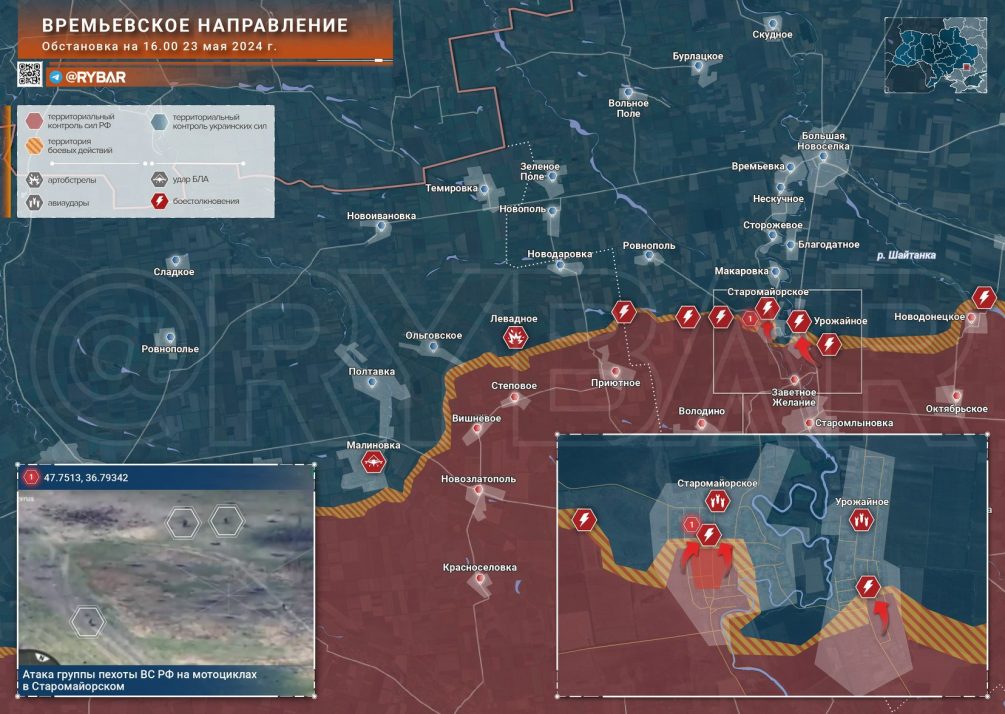 «ВС РФ удалось продвинуться по меньшей мере на 400 метров вдоль улиц Кооперативной и Шевченко и занять центр села Старомайорское. Реальное же продвижение может быть куда большим», - констатирует военный эксперт Михаил Звинчук.