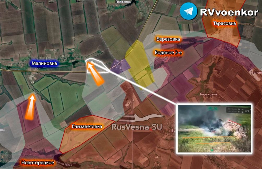 Вчера стало известно, что российская армия заняла большую часть Новооленевки. Также в течение последней фазы наступления освобождены сёла Тарасовка, Водяное Второе и практически полностью — Березовка. По данным с мест, линия фронта продвинулась почти на 5 километров.