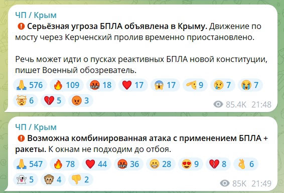 «Фиксируется много запусков реактивных БПЛА противника, возможен запуск морских дронов. Курс на Керчь и Севастополь. В Крыму перекрыли мост через Керченский пролив из-за угрозы обстрелов», - сообщалось в соцсетях после объявления ракетной угрозы.