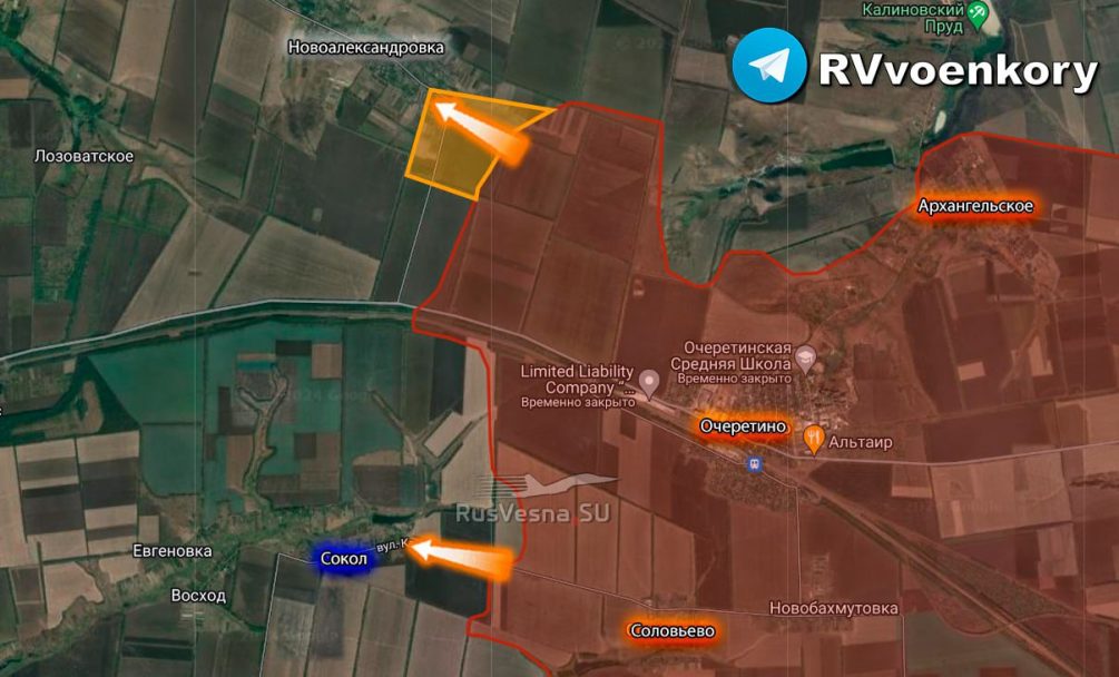 «Штурмовые группы выбили ВСУ с ряда опорников в лесополосах и ворвались с боями в Новооалександровку, заняв до 30% села. Также войска ЦВО продолжают атаки в районе окраин Сокола, расположенного южнее, где не прекращаются ожесточённые бои», - делится подробностями Telegram-канал «Военкоры русской весны».
