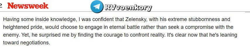 «Имея некоторую внутреннюю информацию, я был уверен, что Зеленский с его крайней степенью упрямства и раздутой гордыней предпочтет вступить в вечную битву, а не искать компромисс с противником. И все же он удивил меня, найдя в себе смелость посмотреть правде в глаза. Теперь ясно, что он склоняется к переговорам», - пишет украинский писатель Майдуков в колонке для западного СМИ.