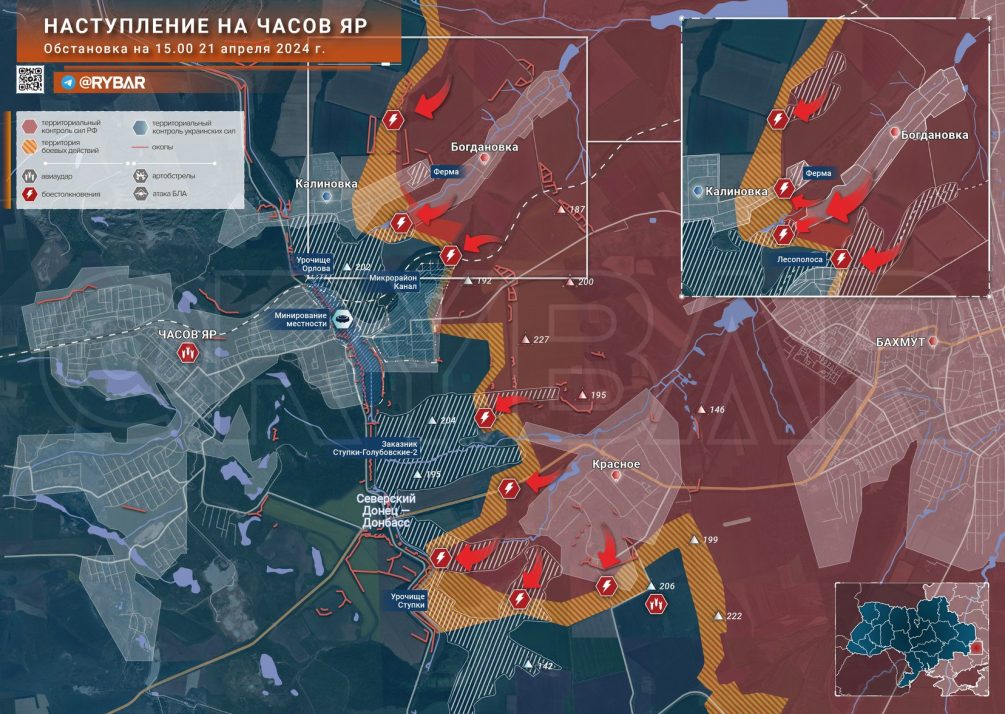Часовоярское направление - нет значительных изменений. Продолжаются бои на восточных окраинах Часов Яра, в районе Богдановки и Клещеевки. Воздушно-космические силы РФ активно атакуют позиции ВСУ.