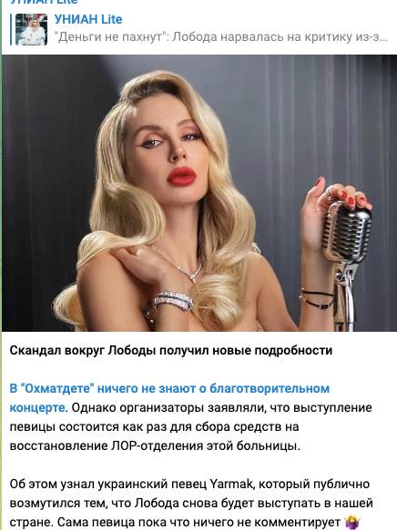 Ранее издание подвергло критике другую украинскую певицу, получившую популярность в России, Светлану Лободу. Из России певица уехала, СВО осудила, но так и не стала «своей» на родине. «Обструкции» Лободу подвергли после того, как выяснили, что она планирует выступить на благотворительном концерте в Киеве в национальной специализированной детской клинике «Охматдет» (Охрана материнства и детства).