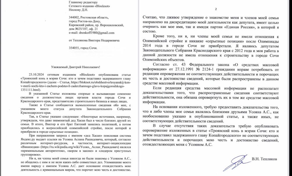 В случае отсутствия таких доказательств требую опубликовать опровержение изложенных в статье «Троянский конь в мэрии Сочи: кто и зачем подставил задержанного главу Копайгородского» не соответствующих действительности и порочащих мою честь и достоинство сведений, отождествляющих меня с Усояном А.С. Подпись: В.Н.Тепляков».