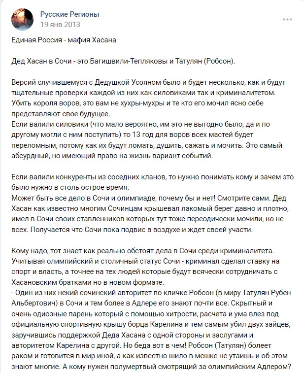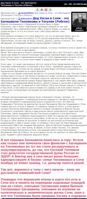 «Некоторые источники, например, утверждали, что даже знаменитый дед Хасан был в числе близких друзей их семьи. В итоге, Виктор и его брат Евгений занялись политикой, а потом приобщились к всероссийской олимпийской стройке, после которой и приобрели в городе серьезные позиции».