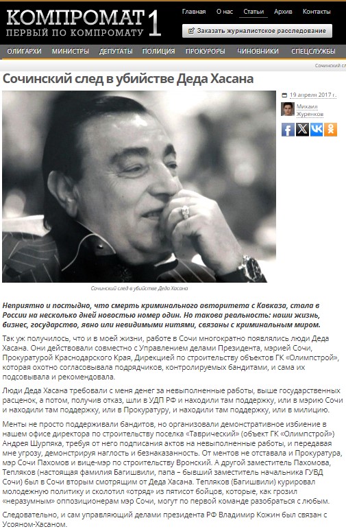 Статья «Сочинский след в убийстве Деда Хасана» на портале Компромат от 19 апреля 2017 года.