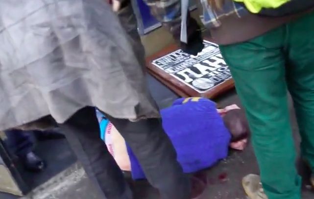 На видеозаписи во время стрельбы на митинге "Антимайдан" в Москве мужчина с флагом ДНР в руках был тяжело ранен. Напал на активиста посетитель одного из кафе - он выскочил на улицу и стал стрелять из пистолета "Оса".