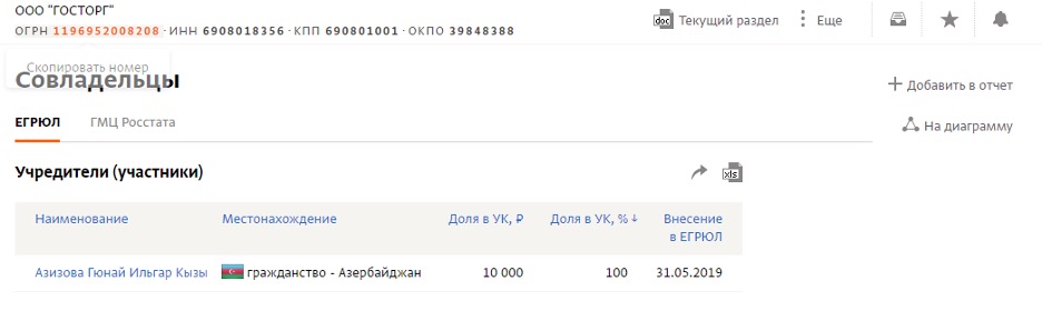 Согласно данным «СПАРК-Интерфакс», компания «Госторг» записана на Азизову Гюнай Ильгар Кызы, уроженку и гражданку Азербайджана.