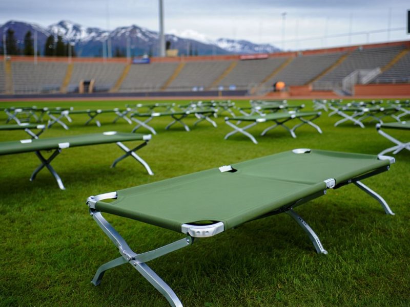 Стало известно, что российских журналистов из кремлевского пула на Аляске разместили на территории стадиона, выделив для сна одноместные кушетки, закрытые шторками.