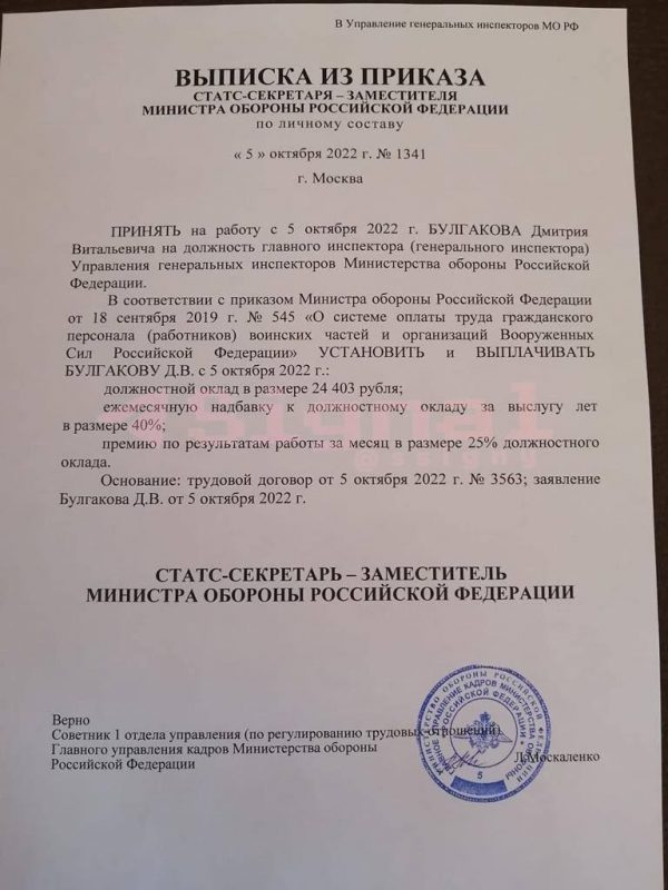 Бывший заместитель министра обороны по тылу генерал армии Дмитрий Булгаков занял должность генерального инспектора в управлении генеральных инспекторов Минобороны России. На такую неординарную должность экс-замминистра перевели после начала частичной мобилизации и критики с обеспечением резервистов.