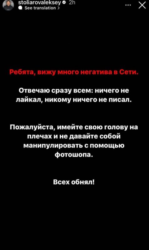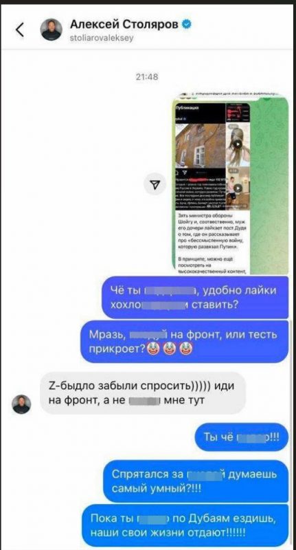Все началось с того, что несколько дней назад в Z-каналах начали активно форситься скрины из постов, в которых муж дочери Сергея Шойгу якобы лайкнул антивоенный пост Юрия Дудя* (иноагент) о «бессмысленности спецоперации». После обвинений в отсутствии патриотизма и призывов отправиться на фронт, Столяров жестко ответил одному из пользователей, якобы обозвав того «Z-быдлом» и тоже предложил ему отправиться на фронт, чем только подогрел тему.