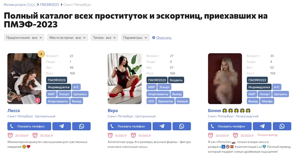 Несмотря на блокировку Роскомнадзора ключевой агрегатор эскортниц продолжает работать в России. В преддверии форума там запустили хэштег ПМЭФ2023, им пометили прилетевших в Петербург эскортниц специально на время форума.