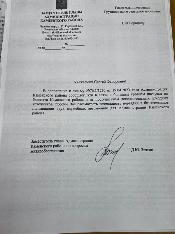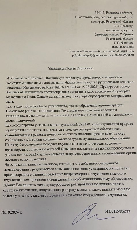 В итоге, старший советник юстиции Коростылев решил, что «нарушений в деятельности лиц администрации Каменского района и администрации Груциновского сельского поселения не установлено, оснований для принятия мер прокурорского реагирования не имеется». О чем и отписал депутату Фоменко и его помощнице Поляковой.