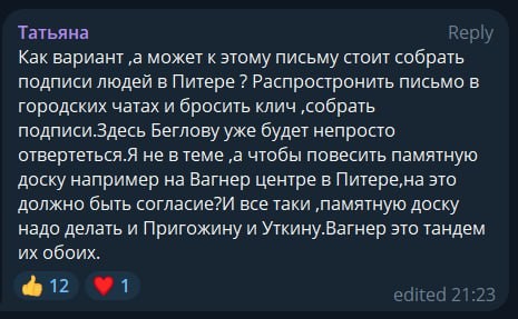 Некоторые подписчики Telegram-канала «Разгрузка Вагнера» считают, что инициатива достойна внимания, и для ускорения ее принятия многие люди готовы собрать подписи для петиции к властям Санкт-Петербурга. По их мнению, установки мемориала заслуживает не только руководитель «Оркестра», но и Дмитрий Уткин.