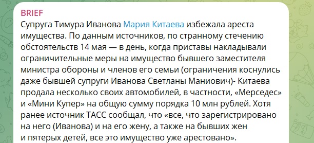 По данным источников канала, по странному стечению обстоятельств 14 мая, когда приставы накладывали ограничительные меры на добро бывшего заместителя министра обороны и членов его семьи (родителей, бывшей супруги Светланы Маниович, детей), Китаева якобы продала несколько своих автомобилей, в том числе «Мерседес» и «Мини Купер». За иномарки, как утверждает канал, женщина выручила порядка 10 млн рублей. При этом 8 мая сообщалось, что суд арестовал даже карты родителей генерала.