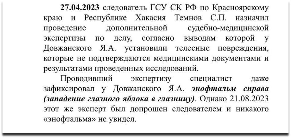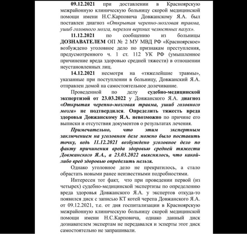 Вообще же следствием был проведен ряд «экспертиз», которые просто противоречат друг другу. Первая экспертиза (проведена непосредственно после конфликта) вообще не показала какой-либо вред здоровью у Довжанского. Вторая (через год после происшествия) выявила телесные повреждения, которых у него не было (например, открытая черепно-мозговая травма и ушиб мозга). Третья (через полтора года после происшествия) опровергла выводы второй и выявила новые телесные повреждения. Несмотря на все это, следователь инициирует четвертую экспертизу и допрашивает эксперта с целью установления у Довжанского тяжкого вреда здоровью и квалификации преступления по тяжкой ст. 111 УК РФ…