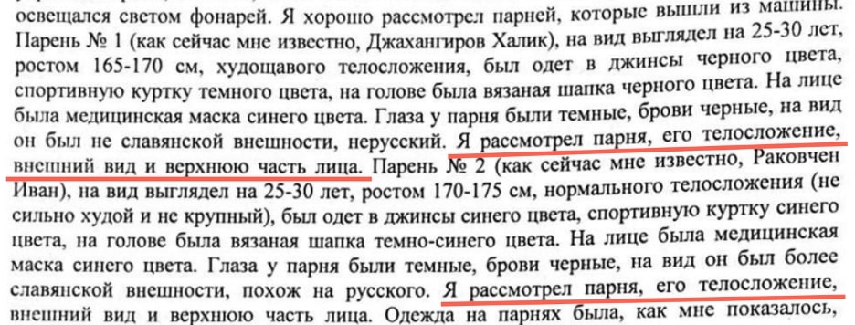 Более того! Видимо, чтобы придать правдоподобность своим показаниям, он говорит, например, что на одном парне ему удалось разглядеть джинсы синего цвета, спортивную куртку синего цвета, вязаную шапку тёмно-синего цвета и медицинскую маску синего цвета. Однако на видео совершенно четко видно, что оба были одеты в чёрную одежду. Ну и так далее. Видимо, здесь обиженный руководствуется принципом нацистских пропагандистов ‒ чем больше мелких деталей, тем правдоподобнее выглядит вранье. Однако уже этого достаточно чтобы обвинить Довжанского в даче заведомо ложных показаний.