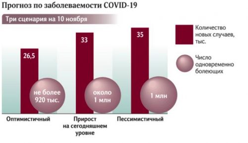 «При оптимистичном сценарии количество ежедневных новых случаев к 10 ноября снизится до 26,5 тыс. Количество активных случаев достигнет уровня 920 тыс. и начнет снижаться», - считает Захаров.