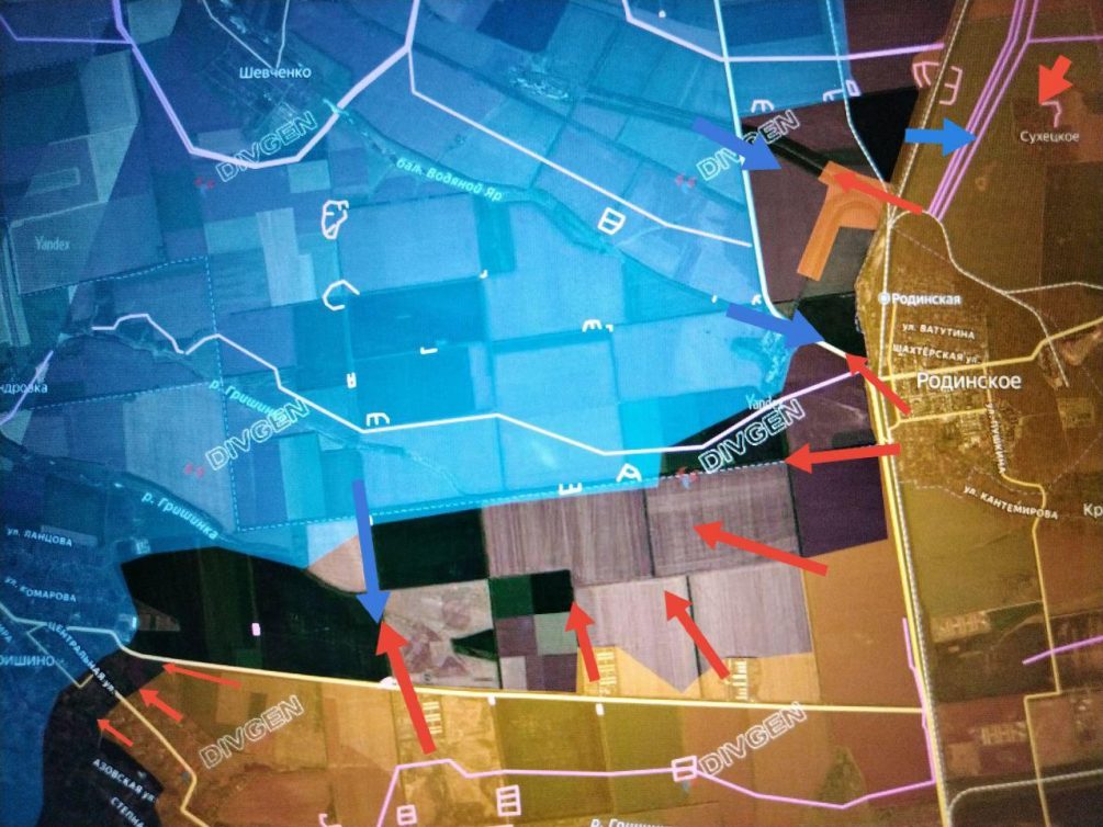 Севернее Родинского наши войска наступают вдоль железной дороги в направлении Шевченко и Белицкого. В районе Сухецкого продолжаются ожесточённые столкновения. Котенок также отмечает, что Новый Донбасс полностью перешёл под контроль штурмовых групп, которые достигли Доброполья и, по оперативным данным, уже ведут боевые действия на его юго-восточной окраине.