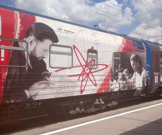 «Никто случайно не в курсе, что именно для Фронта и Победы сделали французские исследователи радиации Пьер и Мария Склодовская-Кюри, умершие в 1906 и 1934 соответственно?» — так была подписана фотография вагона «Поезда Победы».