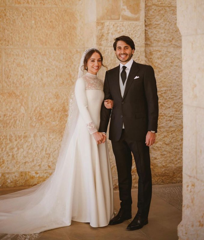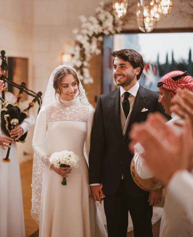 Несмотря на размах свадьбы, принцесса была одета сдержанно - Иман выбрала элегантное приталенное платье с прозрачным ажурным лифом. Весь образ дополнили неброский макияж и аккуратно собранные волосы. Главной деталью образа стала многометровая фата и тиара, усыпанная бриллиантами, которая принадлежит маме невесты - королеве Рании.