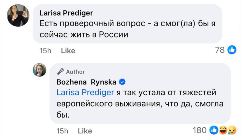 В ответ на это её подписчики предложили ей «контрольный вопрос» - смогла бы сейчас Рынска жить в России. В ответ она разразилась ещё более слёзным заявлением: